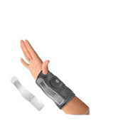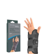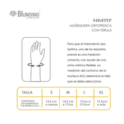 Soporte de muñeca acolchado y recubierta en su interior con tela de algodón. Lleva férula de aluminio removible y ajustable con cierre de contacto.