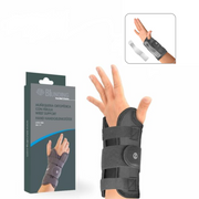 Soporte de muñeca acolchado y recubierta en su interior con tela de algodón. Lleva férula de aluminio removible y ajustable con cierre de contacto.