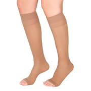 Calcetín color beige de suave microfibra, pre hormado, con compresión graduada alta 20-30 mmHg. Consta de 2 calcetines (derecho e izquierdo) con punta abierta que favorece la comodidad y limpieza del paciente.