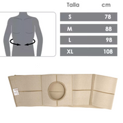 Soporte para colostomía confeccionado con dos bandas de elástico ajustable libre de látex más orificio reforzado con cierre de contacto.