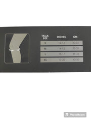 Órtesis de Rodilla con orificio rotuliano, fabricada en laminado de spandex con dos escuadras policéntricas laterales de polipropileno y ajuste superior e inferior con cierre de contacto.